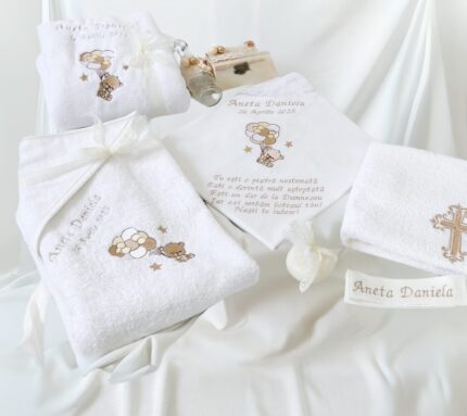 Personalizați fiecare piesă pentru a crea un set unic și memorabil, perfect pentru a sărbătorii botezul într-un mod cu adevărat special.Descoperă magia unui trusou de botez special, creat manual .